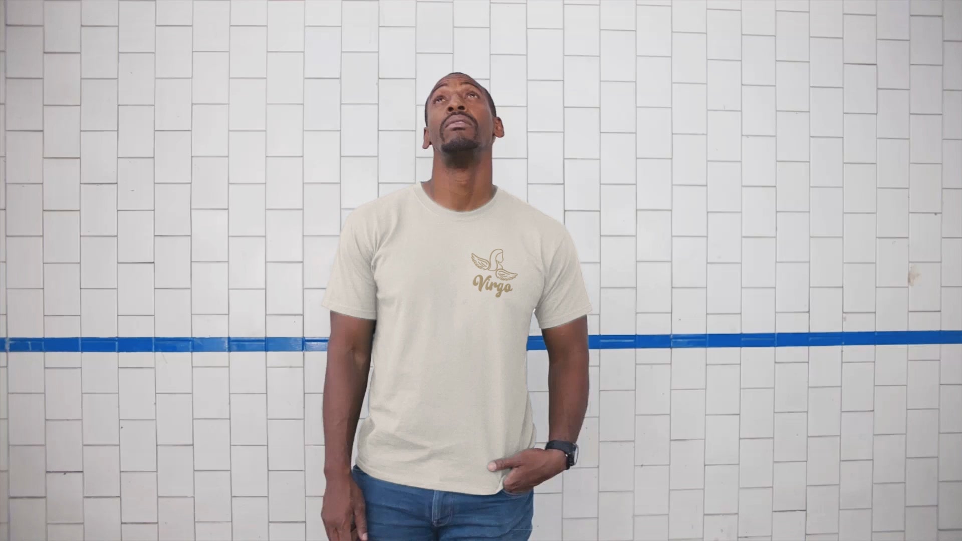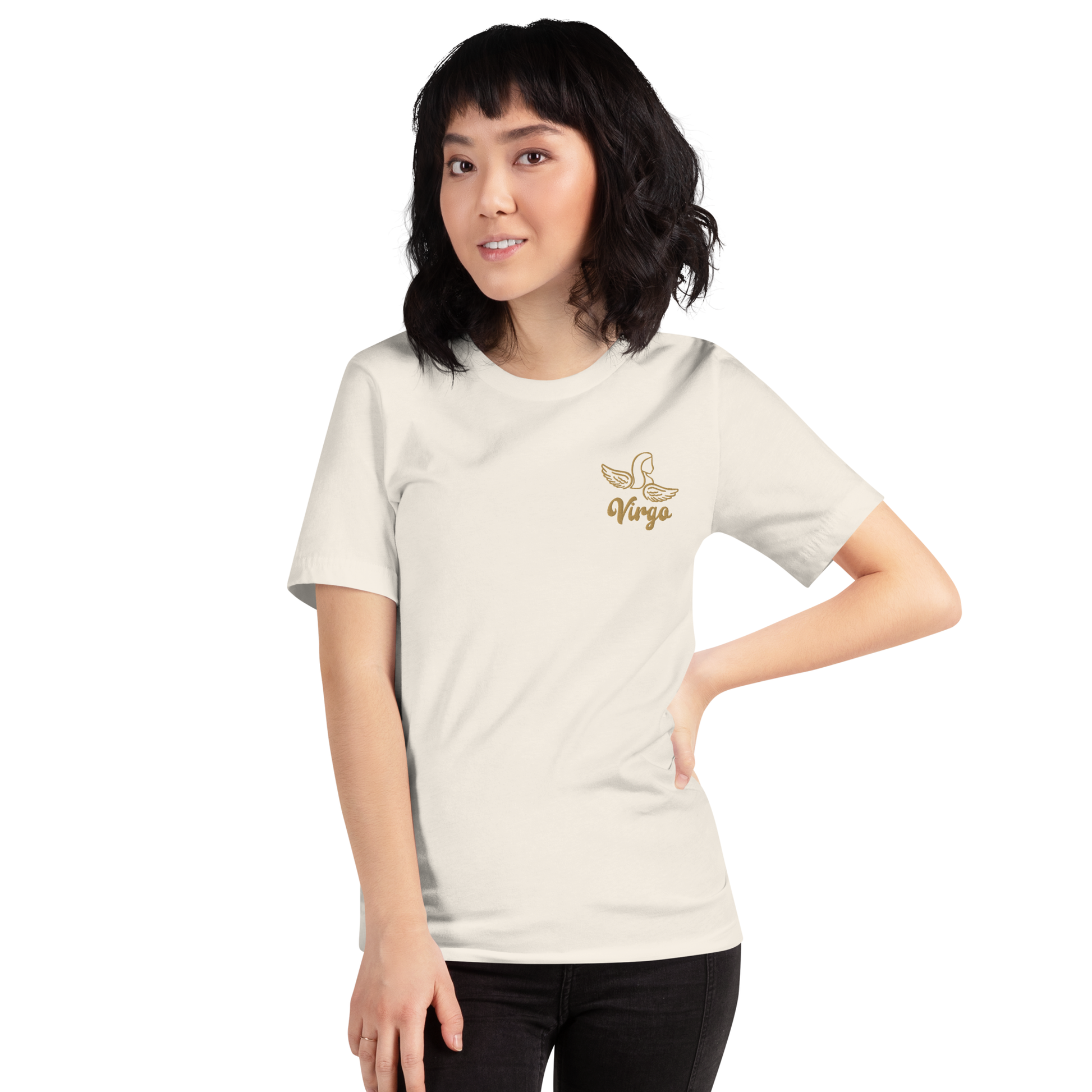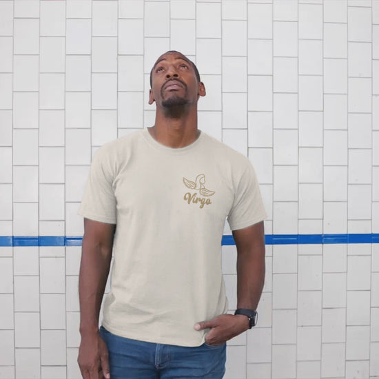 The design features an angel, or maiden, embroidered in Virgo’s power color, brown, on a classic ‘vintage white’ t-shirt.